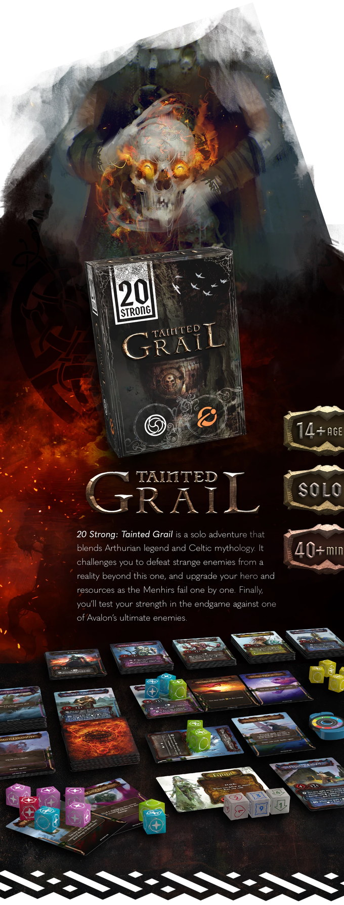 If traditional fantasy is more your speed, though, 20 Strong: Tainted Grail offers a fast-paced take on deckbuilding, giving you an exceptionally easy-to-learn and quick-to-table dark adventure full of crunchy decision-making and experience.