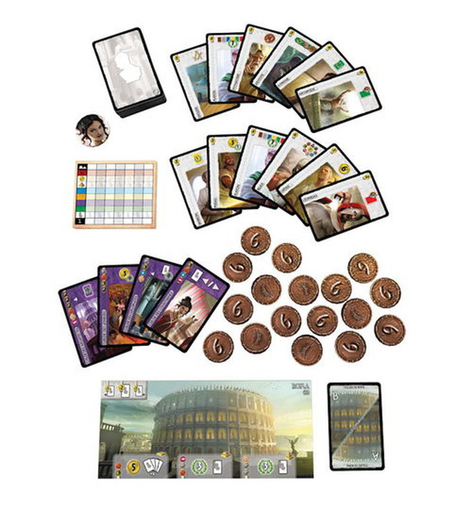 At the start of the game, each player takes a hand of four leaders and may play one at the start of each of the three Ages. Unlike the standard cards, leaders cost money (not resources). The expansion comes with a new Wonder—the ancient city of Rome—and contains 6-gold tokens made of cardboard for more efficient money-management.